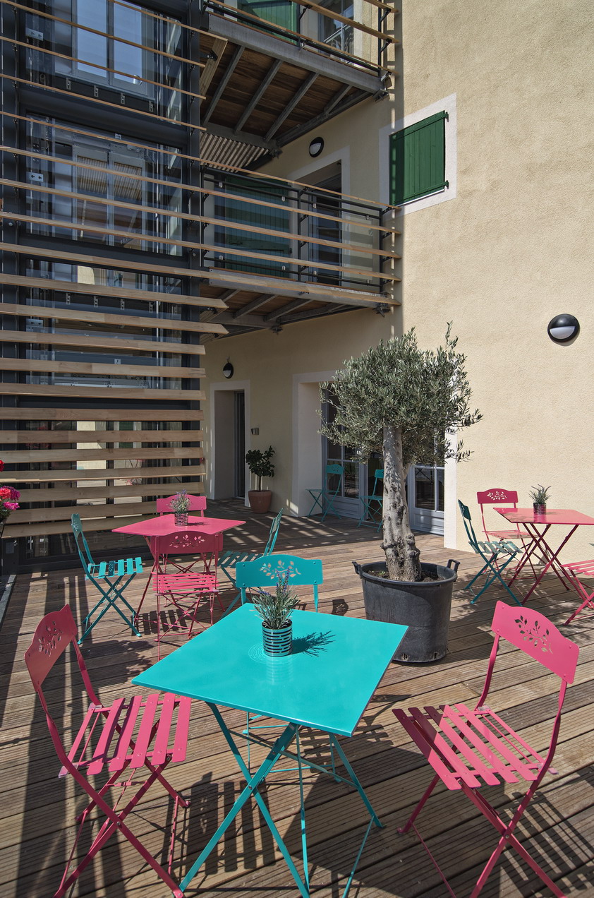 Des sanitaires communs sont accessibles à tous, y compris aux personnes à mobilité réduite. L’accès à la salle peut se faire au choix depuis l’entrée de l’hôtel ou depuis chaque chambre par un ascenseur.